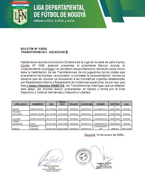 BOLETIN Nº 3/2026- TRANSFERENCIAS JUGADORES