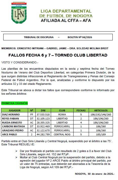 BOLETIN Nº 4 - TRIBUNAL DE DISCIPLINA FALLOS FECHA 6 y 7 - TORNEO DE VERANO CLUB LIBERTAD Comentarios