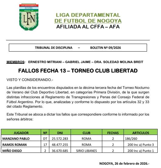 BOLETIN N° 9 - TRIBUNAL DE DISCIPLINA FALLOS FECHA 13° - TORNEO CLUB LIBERTAD HTD - FALLOS Comentarios