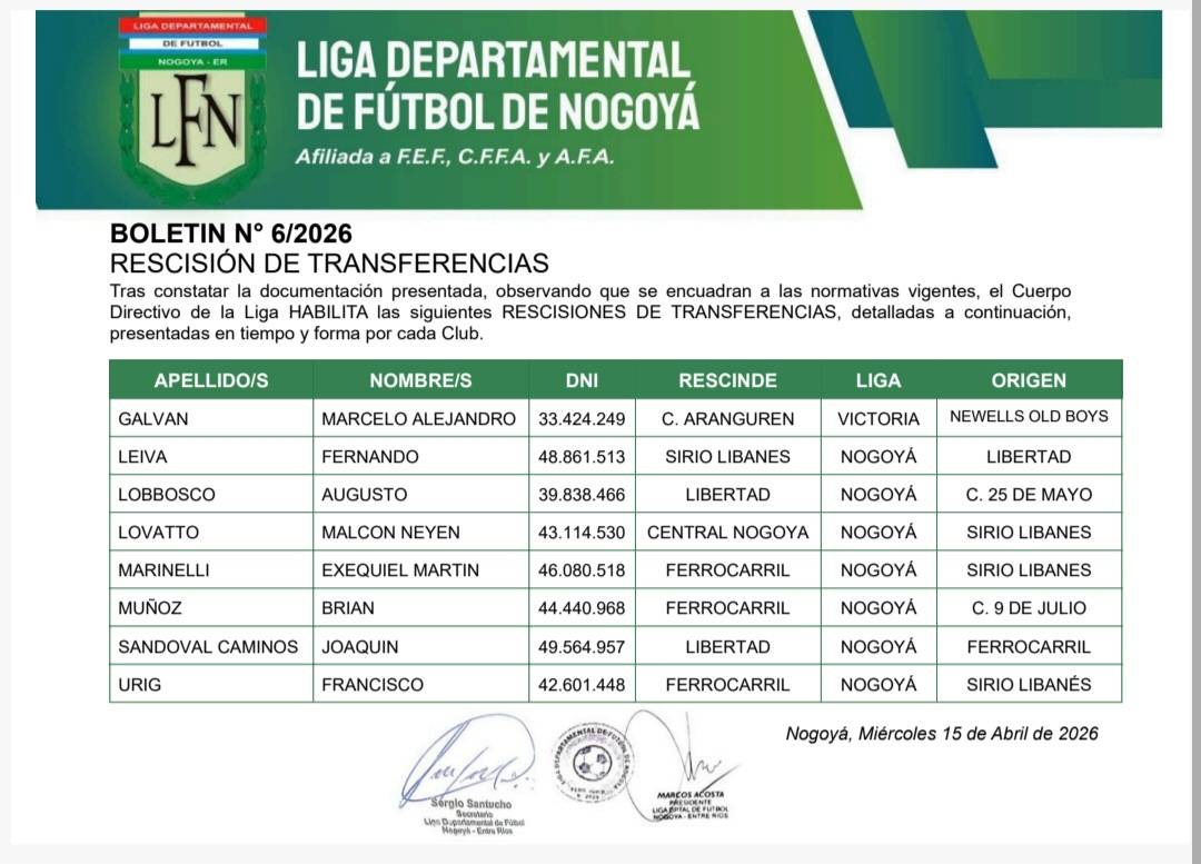 BOLETIN N° 6 - TRANSFERENCIAS DE JUGADORES