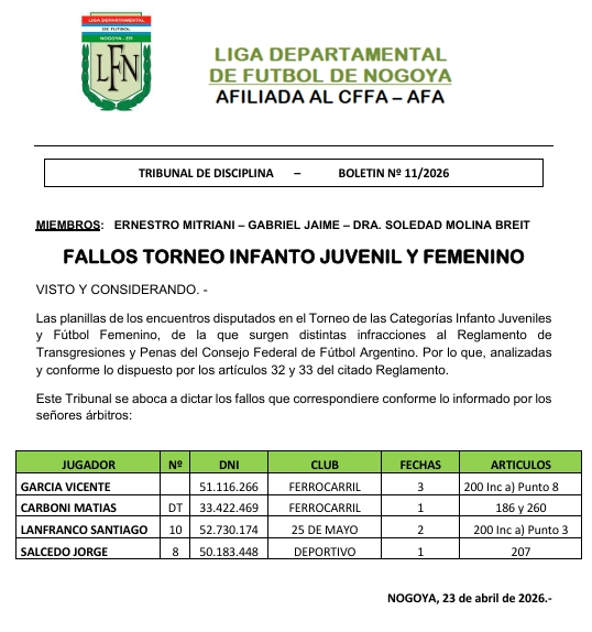 FALLOS FUTBOL INFANTO JUVENIL Y FEMENINO 2026